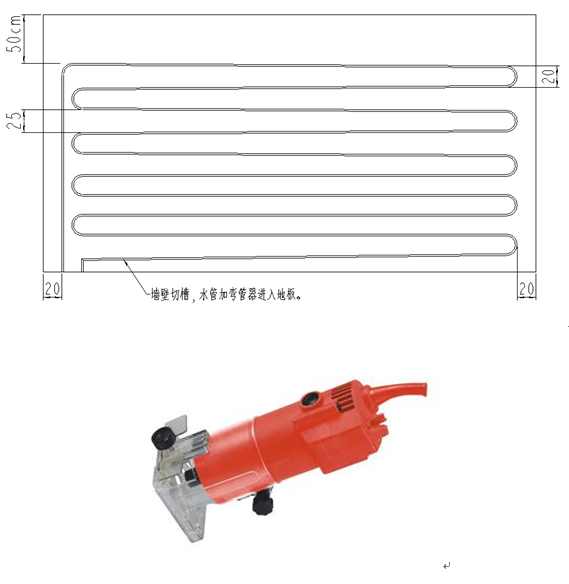在墻壁和地板交界處,現在墻壁內開長約50厘米的槽,槽深逐漸增加到10厘米左右。在管路相應位置裝上彎管器,使管路折彎處陷入墻壁內,保證能平整的進入地板。